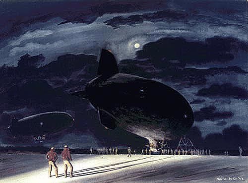 A Navy airship rests immobile at its mooring mast, engines idle, as its crews walks forward in a floodlight's illumination. Engines soon will turn over, and it will be released to take to moonlit skies on a night mission. Meanwhile the ground crew, hands in pockets against the sharp night air, idle alertly in position until they are called to the handling lines. (http://www.naval-airships.org/page-770913)