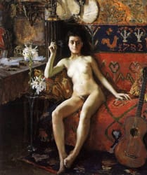 Démasquée is an exceptionally erotic painting in Akseli Gallen-Kallela's oeuvre. It was apparently commissioned by H.F. Antell, a Finnish collector, but when he saw the painting he rejected it. There are many indications in the picture of what Bohemian life was like in those days; yet submitting to its joys involved a risk of destruction. The lily symbolizing innocence is contrasted with the extremely carnal female model and the guitar whose shape further heightens the sense of the erotic. Attention is also focused on the figure of Death grinning in the background. There are also elements which seem to sully the sacred: the paraphernalia in Gallen-Kallela's studio included a crucifix and a Buddha statue, which seem tainted by association being featured in the same painting as this at once alluring and intimidating female flesh - not to mention the ancient, quintessentially Finnish rya rug. (https://www.google.com/culturalinstitute/beta/asset/démasquée/fwE0w5T_rcybzA)