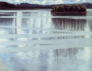 The apparent tranquility of this naturalistic landscape is disturbed by the currents crossing the water and the alarming impenetrability of the dense island. The ripples are supposed to have been made by the boat of Väinämöinen, the legendary bard of Finnish folklore.