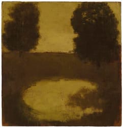... to the right hangs the chilling pair of landscape studies, the very green Landscape with Two Trees and River and the very brown Twin Trees. Both offer subdued and charged looks not only at the landscape but at the kind of open-air painting artists used to gather in the fields of southern France and the Hudson Valley to do. (http://artseditor.com/site/domesticated-nature/)