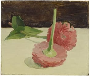 Even today York's pictures insist on the sturdy monumentality that inhabits the solidity of simple subjects. Two Zinnias (circa 1965), for one, depicts a pair of puce flowers resting on a cream-colored surface; their rounded petals and cut stems contrast strikingly with the panel's black horizon, suggesting liftoff into nothingness.