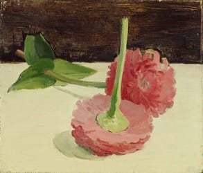 Even today York's pictures insist on the sturdy monumentality that inhabits the solidity of simple subjects. Two Zinnias (circa 1965), for one, depicts a pair of puce flowers resting on a cream-colored surface; their rounded petals and cut stems contrast strikingly with the panel's black horizon, suggesting liftoff into nothingness.