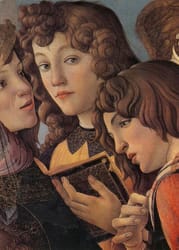 Diameter 143,5 cm. The pomegranate in Mary's hand explains the title: it symbolizes Christ's Passion, the wealth of seeds conveying the fullness of Christ's suffering. A comparison of this painting with Botticelli's earlier tondo Madonna del Magnificat reveals that the artist has now arranged the angels symmetrically, thereby avoiding the compositional difficulties of the older depiction. The Christ Child, whose hand is raised in blessing, is lying securely in the arms of Mary, but the sad, melancholy expression on the faces of mother and child are intended to remind the observer of the torments the Son of God will suffer in the future. The angels are worshiping Mary with lilies and garlands of roses. The Rosary is a prayer that was created in its present form in the 15th century, and rapidly became widespread. The beginning of this prayer is embroidered on the left angel's stola: AVE GRAZIA PLENA (Hail Mary, full of grace). (https://www.wga.hu/html_m/b/botticel/22/40pomegr.html)