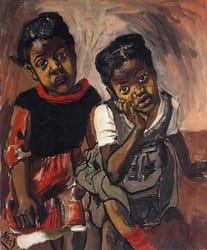 "The world treats your children as you have treated them," Neel once observed. And when she came to paint children, she was always concerned to treat them as equals. She also had some tricks to keep their attention. "She would suddenly miaow like a cat to keep the children interested while they were sitting," says Als. "I love this painting as a kind of perversion of a Sunday-school portrait. There is a kind of fierceness to the girls. Alice liked that. She wanted girls who would stand up to the challenge of being painted."