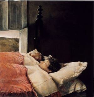 “Open Shutter” is from the south side of the house. It has a composition like a photo. The frame cuts into the painting in a brutal way which helps to fight the basic neatness of a watercolor. Although the scene mainly is a wall surface, the painting has a fine depth created by branches, shadows and green vegetation on the right side. As always, Andrew Wyeth was able to create strong dark colours, as seen in the vegetation and in the window, opposite to most artists’ use of the watercolor medium.
