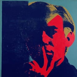 The close-up view of his own face in this pair of self-portraits is a dead giveaway of a cheap photo booth. The rapt attention and the fingers touching his mouth are a mannerism borrowed from the poses matinee idols struck in the 1940s. The colors are chosen with pure indulgence. Despite those affectations, the artist allows us a glimpse of himself as an intensely private individual who hides behind his public persona.