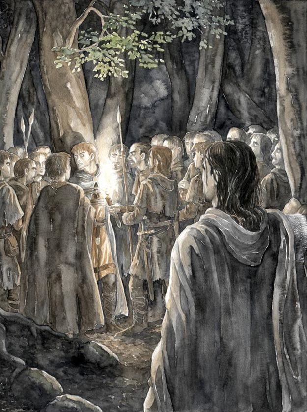 "Then at the egging of Andróg they left Beleg tied to the tree without food or water, and they sat near eating and drinking; but he said no more to them. When two days and nights had passed in this way they became angry and fearful, and were eager to be gone; and most were now ready to slay the Elf. As night drew down they were all gathered about him, and Ulrad brought a brand from the little fire that was lit in the cave-mouth. But at that moment Túrin returned. Coming silently, as was his custom, he stood in the shadows beyond the ring of men, and he saw the haggard face of Beleg in the light of the brand."