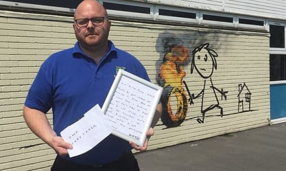 The letter reads: "Dear Bridge Farm School, thanks for your letter and naming a house after me.