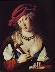Date given as 1512 or 1520. One source seems to suggest (plausibly) that the hammer indicates that she is being painted as the biblical Yael. (http://jewsinmedievalart.tumblr.com/post/88844248924/portrait-of-a-jewish-woman-with-tools-bartolomeo)