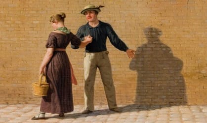 Eckersberg is a storyteller. He edits his pictures in order to make a particular tale come to the fore.... the image underwent a transition as the drawing was turned into a painting... The painting seems to show a simple, everyday scene. But even though the couple are taking their leave of each other, their shadows merge on the wall behind them as they say goodbye, suggesting that they will be reunited. (http://www.smk.dk/en/visit-the-museum/exhibitions/ensmuklgn/artwork-a-sailor-taking-leave/)