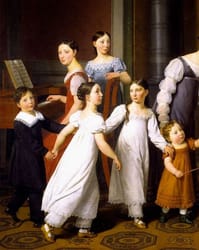 For several years, Nathanson was Eckersberg's most important client. Apparently, the artist's original concept for this large group portrait was to portray the family in a casual and private moment; in one preliminary sketch, he depicted children and parents alike performing a circle dance. But his patron had a specific purpose behind the commission, something that would show just how far the poor Jewish boy had come in life, something to commemorate a specific incident: Nathanson and his wife are shown arriving home, being greeted by their children after their audience with the Queen.