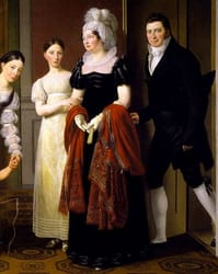 For several years, Nathanson was Eckersberg's most important client. Apparently, the artist's original concept for this large group portrait was to portray the family in a casual and private moment; in one preliminary sketch, he depicted children and parents alike performing a circle dance. But his patron had a specific purpose behind the commission, something that would show just how far the poor Jewish boy had come in life, something to commemorate a specific incident: Nathanson and his wife are shown arriving home, being greeted by their children after their audience with the Queen.