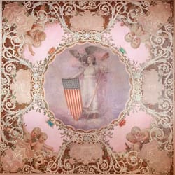 Along the center of the ceiling are panels by Carl Gutherz that represent civilization through the Spectrum of Light. Each of the seven panels, unfortunately rather pale (though the artist's copyright notices are still legible), features a central figure who symbolizes some phase of achievement, human or divine. The cherubs in the corners of each panel represent the arts or sciences, and the escutcheons in each panel present the title of the decoration, the seals of the various states of the nation, and the mottoes of those seals. (Several of the seals do not have mottoes and the seals of California, Minnesota, and South Dakota are omitted altogether.)