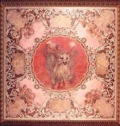The seven panels in the ceiling, decorated by Carl Gutherz, represent the Spectrum of Light. Each panel contains one of the spectrum's seven colors with a central figure representing human or divine achievement. There are two cherubs in each corner representing arts or sciences and eight escutcheons, one with the title of the decoration and the seals of states. These elements are combined into an elaborate scroll design.