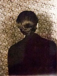 Although Stieglitz had a virtual monopoly on photographing O’Keeffe during her New York years, Carl Van Vechten succeeded in making a few images of her, Van Vechten, a well-known novelist, critic, and tastemaker, made portraits of America’s distinguished artists and writers in his New York studio. He typically posed sitters against a backdrop of patterned wallpaper of fabric he selected to correspond to some aspect of their work. He had O’Keeffe, a painter of oversize flowers, stand in front of floral patterns. He captured her from the front wearing a close-fitting cap and a bow at her neck. In this image, she turned her back to the camera so that he could record how carefully she braided the ends of her long hair and wrapped the plaits into a flat oval knot.