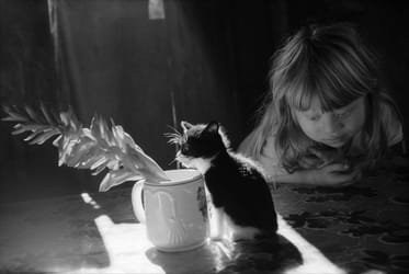 ...The symbolism is even more direct in the still life Chan Bor Will With Cat. That print shows a child in shadow, contemplating a kitten and a flower that are bathed in a dramatic shaft of light. The cat's fur and delicate limbs are thrown into immaculate relief, as are the flower's petals. What could be more unspeakably vulnerable than a child, a kitten, a flower? Nothing, Yarrow implies, except perhaps for an entire culture on the cusp of extinction.