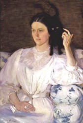 This portrait by Cecilia Beaux portrays the artist's cousin, Sarah Allibone Leavitt, dressed in white with her black cat on her shoulder. Beaux was recognized not only for her bold painting technique, but also for her ability to imbue her female subjects with wit and intelligence, rendering them more than just mere objects of beauty. A student in Paris in the late 1880s, the artist was influenced by her firsthand exposure to French impressionism. Her light-filled palette and gestural style invite comparisons with many of her contemporaries, including William Merritt Chase, James McNeill Whistler, John Singer Sargent, and Mary Cassatt.