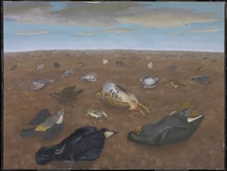 Morris had painted birds quite often since the 1920s. Here he shows a variety of dead or dying birds in a desolate landscape. A rook and moorhen are in the foreground, and a male partridge dominates the center of the composition. Morris made the work in response to the devastating effects of certain crop-sprays and pesticides on the bird population. Some of his friends have recalled his anger and frustration at the pitiful destruction of birdlife around his home at Benton End in Suffolk. The ill-effects of some pesticides were first noticed in the mid-1950s. By the end of the decade large numbers of birds were found dead in the fields. (http://www.tate.org.uk/art/artworks/morris-landscape-of-shame-t04996)