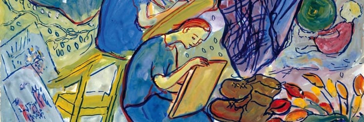 There is no text, music or transparency associated with this gouache. This work is a gouache by Charlotte Salomon, part of her principal work Life? or Theatre?. It is placed by editors towards the end of Act 2 of the Prelude. It depicts the fictional Charlotte Kann at work after taking drawing lessons following a discouraging start that had seen her fail her first test for admission to the Academy of Arts. She subsequently gains admission (Felstiner pp. 36-9). Salomon herself attended the Vereinigte Staatsschulen für freie und angewandte Kunst (United State Schools for Pure and Applied Arts) in Berlin from 1936 to 1938 on the strength of the Gesetz gegen die Überfüllung deutscher Schulen und Hochschulen (Law Against Overfilling the German Schools and Colleges), which provided that up to 1.5% of the student body might be of Jewish origin if their fathers had served at the front in the First World War (Salomon's father had been a military doctor). But by Summer 1938 it became too dangerous for Charlotte to attend in case her Jewish backgound was discovered and she did not return, despite winning a prize (Fischer-Defoy and Belinfante, pp. 17-21). Mary Felstiner, Salomon's principal biographer, notes that the chair, shoes, fruits, and sunflowers make the picture a homage to Vincent van Gogh, who himself had faced a discouraging start to his career. (p. 37). Judith Belinfante notes that Salomon scribbled a comment in pencil (at JHM 4918?): "That which van Gogh attained later in life, ... a brushstroke of unprecedented lightness, which unfortunately seems to have a distinctly pathological side, I have attained already" (Herzberg, viii). Felstiner remarks that van Gogh is the only artist Salomon mentions in her notes (p. 66). [https://commons.wikimedia.org/wiki/File:Charlotte_Salomon_-_JHM_4351.jpg]