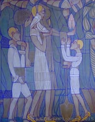 A wedding is taking place on the stained glass windows, quite respectably in contemporary attire. The procession of guests coming to give the bridal couple their gifts was inspired by a wedding ceremony Chris Lebeau once attended at the court of the Sultan of Yogyakarta. As we 'read' on, we come to the southern wall, where family life, maternal care and paternal admonitions set the tone. Was this the work of an anarchist, a long-haired bohemian with an unkempt beard and bare feet in sandals? Yes, but he was an anarchist imbued with the ethos of the late nineteenth-century Arts and Crafts movement.
