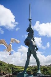 A 66 foot bronze-clad sculpture, meant to be a modern allegory of truth and justice. The figure's stance is taken from Degas' late 19th Century Little Dancer of 14 Years and is referenced by Damien Hirst in his earlier bronze Virgin Mother from 2005. 'Verity' is from the Italian word of Truth, while she holds the traditional symbols denoting justice – a sword and scales. See more at http://designdaily1.rssing.com/chan-5510314/all_p3.html .