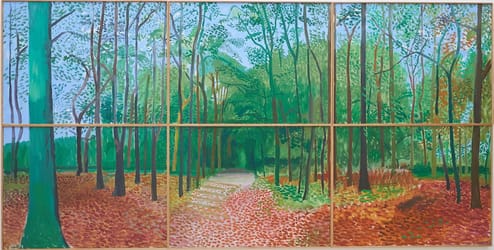 Perspective and the representation of space in two dimensions has remained a crucial interest and curiosity of Hockney’s since the early 1960s. In Hockney’s Woldgate Woods, 24, 25, and 26 October 2006, the artist frames an ambitiously exaggerated, widened vantage point, wrestling with the authority of one-point perspective.....