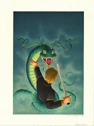 Original Cover Art Painting for The Silver Chair by David Wiesner from C.S. Lewis's The Chronicles of Narnia. Eustace and Jill escape from the bullies at school through a strange door in the wall, which, for once is unlocked. It leads to the open moor...or does it? Once again Aslan has a task for the children, and Narnia needs them. Through dangers untold and caverns deep and dark, they pursue the quest that brings them face to face with the evil Witch. She must be defeated if Prince Rilian is to be saved. King Caspian's beloved son Prince Rilian has disappeared. Aslan sends Eustace and his school friend Jill to Narnia on a quest to search for the young prince and defeat the evil Witch. Two English children undergo hair-raising adventures as they go on a search and rescue mission for the missing Prince Rilian, who is held captive in the underground kingdom of the Emerald Witch.