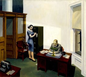 Although Hopper is today one of the most beloved of American realists, he was slow to achieve success. He had his first solo exhibition in 1920, at the age of 37; nothing sold and there was little critical attention. But by 1930 his paintings had started to enter museum collections, and in 1933 the Museum of Modern Art, New York, mounted the first retrospective of his work. Office at Night (1940), one of Hopper’s best-known paintings, was inspired by a scene the artist glimpsed through an office window during a ride on one of New York’s elevated trains. In 1948, Hopper wrote to a Walker curator to explain that his aim with the painting was to evoke a lonely office interior high in the air. He declined to be specific about what was happening there, preferring to let viewers construct their own narratives.