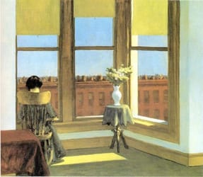 "Excuse me, but am I the only person here who thinks that the image of Mrs. Bates, alone in her rocking chair, sitting in a window of the Bates Mansion, might owe some of its mood to Room in Brooklyn? The ennui of the scene evokes Norman's own boredom, as a man isolated, solitary and trapped in a world not of his choosing, looking out on a maddeningly unchanging landscape." (http://www.alfredhitchcockgeek.com/2009/11/hitchcocks-most-hopperesque-film-psycho.html)