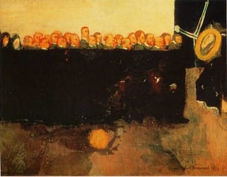 "...Émile Bernard's letter to Albert Aurier provides details of the funeral which was held in the afternoon of 30 July 1890. Van Gogh's body was set out in "the painter's room" where it was surrounded by the "halo" of his last canvases and masses of yellow flowers including dahlias and sunflowers. His easel, folding stool and brushes stood before the coffin. Among those who arrived in the room were artists Lucien Pissarro and Auguste Lauzet. The coffin was carried to the hearse at three o'clock. The company climbed the hill outside Auvers in hot sunshine, Theo and several of the others sobbing pitifully. The little cemetery with new tombstones was on a little hill above fields that were ripe for harvest. Dr Gachet, trying to suppress his tears, stammered out a few words of praise, expressing his admiration for an 'honest man and a great artist... who had only two aims, art and humanity.'" (https://en.wikipedia.org/wiki/Death_of_Vincent_van_Gogh)