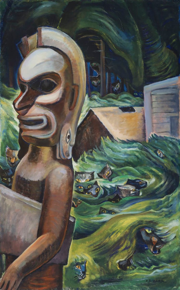 Carr describes the encounter in her book Klee Wyck: “There we were—D’Sonoqua, the cats and I—the woman who only a few moments ago had forced herself to come behind the houses in trembling fear of the ‘wild woman of the woods’—wild in the sense that forest-creatures are wild—shy, untouchable.”