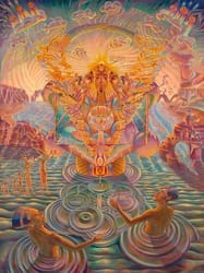 They showed me in the water, reflections of the flower of life. Emerging from this is the geometry of Metatrons cube, within which are all the platonic solids, which relate to the elements & energy bodys. Fire; the star tetrahedron: the Sun rays & flames of demons transmuting to Phoenixes. Water, the icosohedron, emotion, the grail. Earth, the cube, Ophiucian snake staffs that turn into psychedelic ayahuasca vines. Air in the buddhist style clouds. The Alchemy of all these elements gives us harmony, & the gift of the elixir of life…the Holy Grail. In the centre is the Pharaoh Akhenaten, the 17th dynasty Pharaoh who united Egypt in the worship of the sun as a living conscious being. I met his sculpture 20 years ago in.... (http://emanations.co.uk/art/akhenaten/)