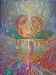 The Holy Grail has long been revered in Art as a symbol of the divine feminine. Inspired by the Mythic Tarot, it invokes the Magus card, moment the Magician becomes empowered & picks up the 4 magical elemental tools, the sword, wand, pentacle & grail, & realises he/she is master of their destiny.