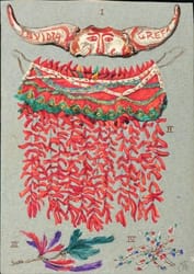 This is one of a group of watercolors by Estella Canziani in the Birmingham Collection. They are particularly valuable in providing documentary information on the clothes and associated lifestyle of the local people living in remote villages in Northern Italy. This watercolor study shows painted ox horns from S.Stefano (i), red fannel decoration hung between ox horns and arranged over the face of the oxen (ii), feathers dyed red, green and prurple, Cocullo (iii), thread with colored knots to bind around the wrists and necks, Scanno and Cucullo.