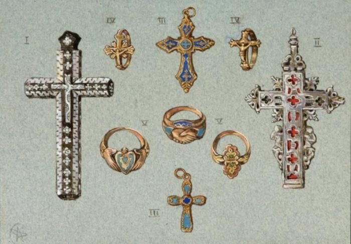 This is one of a group of watercolors by Estella Canziani in the Birmingham Collection. They are particularly valuable in providing documentary information on the clothes and associated lifestyle of the local people living in remote villages in Northern Italy. This watercolor of jewellery includes an ebony and mother of pearl cross (i), a silver cross containing relique (ii), types of crosses decorated with enamel (iii), rings from Scanno (iv), types of gold and enamel rings (v).