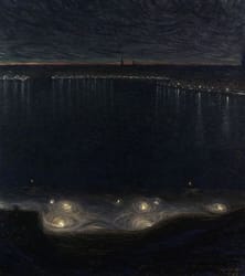 He lived his whole life together with his mother and brother at Södermalm, the southern part of Stockholm. They eventually settled in a flat at No. 40 Bastugatan, on a height with a view over most of central Stockholm including the Riddarfjärden bay and the Old town. Most of his paintings from the 1890s up to 1904 are night views over Riddarfjärden, as he would have seen it from his home, or street views from various parts of Södermalm. They are dominated by shades of blue and very visible brush strokes, often crossing one another. Over the years his paintings moved towards increasing simplification and abstraction, and at the end of his "blue" period, little more than the street lights and their reflections in the waters can be discerned from the mass of blue of the canvas. (https://en.wikipedia.org/wiki/Eug%C3%A8ne_Jansson)