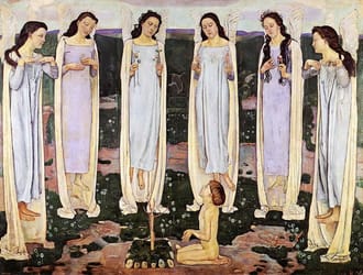 Hodler developed a style he called "parallelism" that emphasized the symmetry and rhythm he believed formed the basis of human society.[3] In paintings such as The Chosen One (1893), groupings of figures are symmetrically arranged in poses suggestive of ritual or dance. Hodler conceived of woman as the embodiment of the desire for harmony with nature, while a child or youth represented innocence and vitality. (https://en.wikipedia.org/wiki/Ferdinand_Hodler)