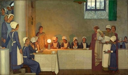 One painting in a set of four allegorical paintings on the theme of the 'Acts of mercy' commissioned from F. Cayley Robinson for the Middlesex Hospital in 1912. The hospital was demolished in 2008 and the paintings were acquired from the health authority in 2009.