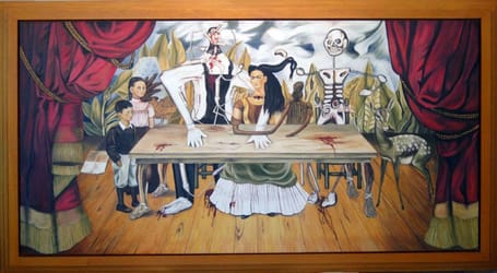 Kahlo painted this work during her divorce from Diego Rivera, and her state of mind is reflected throughout this painting. The painting resembles a skewed version of The Last Supper with Frida playing the role of Christ at the center of the table. She is surrounded by an eclectic assortment of characters: Cristina's 2 children, a large papier-mâché Judas, a skeleton, a pre-Columbian sculpture and her pet fawn Granizo. The Judas, the skeleton and the pre-Columbian idol are 3 of the 4 characters in her earlier painting The Four Inhabitants of Mexico City, 1938.