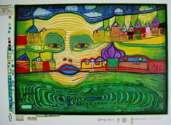 One of his strongest and most enduring images, Irinaland Over the Balkans (1969), was inspired by Bulgarian actress Irina Maleeva. The original painting had been done on aluminum foil covered with layers of paper. As he revised graphic conceptions derived from it, the silkscreen was a new work, full of marvelous graphic devices. Each version of the theme became stronger, more compositionally focused. Irinaland over the Balkans bespeaks love of a woman, the land, and art. Through and above the landscape floats Irina’s face. This painting finalizes much of the artist’s previous experimentation. It reaches a new frontier of formal and technical achievement, while distilling and emotional essence. (http://www.widewalls.ch/artist/friedensreich-hundertwasser/)