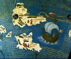 ....There are 16° errors in the location of many of the places, whereas modern maps seldom have more than 1°, because longitude was very difficult to ascertain before the invention of accurate clocks. The antiquity of this globe and the year of its execution, on the eve of the discovery of the Americas, makes it not just the oldest, but the most historically valuable globe. It corresponds particularly well with Columbus's notion of the Earth, and makes the notion of a jump across that little Ocean Sea to the Far East irresistible; he and Behaim drew their information from the same sources. ....as a scientific work it is of enormous importance; it may be the first terrestrial globe ever built, is tilted to spin at the correct angle, and represents an encyclopedia of the West's known world in the year 1492. (https://en.wikipedia.org/wiki/Martin_Behaim)