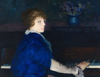 Bellows was a highly sensitive portraitist, often depicting his wife Emma and their two daughters. Emma at the Piano is often considered the artist’s finest portrait of his wife. Bellows reduces the composition to one of near-geometric purity, as the dark horizontal of the piano contrasts with the white band of the keys and serves as backdrop for Emma’s vibrant cobalt blue gown. (http://books0977.tumblr.com/post/151538033062/emma-at-the-piano-1914-george-bellows)