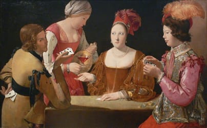 One of the greatest masterpieces of 17th-century French art, Georges de La Tour’s Cheat with the Ace of Clubs takes as its subject the danger of indulgence in wine, women, and gambling... La Tour’s dazzling colors and elaborate costumes create a brilliant tableau. His characters enact a psychological drama that unfolds through the cues of their sidelong gazes and the measured gestures that signal their next moves. More at https://www.kimbellart.org/collection-object/cheat-ace-clubs