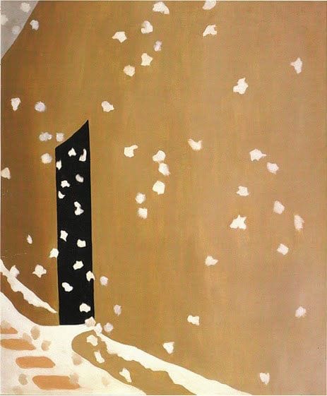 "...a near-abstraction of a door in the inner patio of her Abiquiu House… She wrote: “As I climbed and walked about in the ruin I found a patio… with a long door on one side. That wall with a door in it was something I had to have. It took me ten years to get it—three more years to fix the house so I could live in it—and after that the wall with a door was painted many times.” http://blogs.artinfo.com/lacmonfire/2015/07/21/georgia-okeeffes-black-door-with-snow/