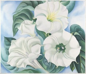 The four blossoms are placed in an energetic design that repeats the tight rhythm of the jimson weed's pinwheel-shaped flower. About this plant, which grew near the artist's home in New Mexico, O'Keeffe said, "When I think of the delicate fragrance of the flowers, I almost feel the coolness and sweetness of the evening." She emphasized her subject's fresh beauty with a bright, simplified palette and rhythmic treatment of light and shadow.