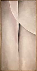 O’Keeffe enjoyed painting entire pictures in shades of black and white, the same restricted palette she used in dress. First in her absract drawings and watercolors in the 1910s, then in oil paintings of the 1920s, she made black and white into “colors” that were subtle and versatile. Sometimes she juxtaposed them; she also mixed the two and came up with a beautiful tonal range of grays. This narrow, vertical abstraction may have been informed by O’Keeffe’s paintings of modern skyscrapers of Manhattan in the late 1920s.