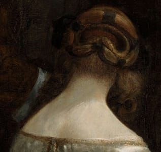 The impeccably groomed young woman glances up questioningly at an older woman in dark clothing. The lady’s facial expression is clear to see in the mirror before her. The painter has imbued the scene with deeper meaning, for the mirror signifies vanity and the transience of life. The message conveyed here is that beauty and youth will ultimately fade.