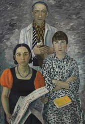 From 1921, Gino Severini developed a figurative form of expression that he described as ‘realistic’. Nonetheless, this work, based on a photograph, depicts Severini posed in a space without any apparent semblance of reality. He is holding his pigeon Don Glu-Glu in one hand while seated in front of him are his wife Jeanne with an open newspaper and his daughter Gina. The deep melancholy of the family members and the dark palette possibly prefigure the sinister period of fascism. The gravity and frozen expressions of the figures evoke the early medieval mosaics of Ravenna and the church of Santa Maria Maggiore in Rome. (http://www.i-am-here.eu/en/gallery.html)
