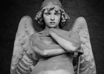 There is a sad look on the face of the angel guarding the tomb of the Oneto family, in the cemetery of Staglieno, in Genoa. The beautiful creature seems to be looking for something ahead, lost in thought, arms folded in front of his heart – a gesture kinesics interprets as a defense against one’s worries. The statue was sculpted in 1882 by Giulio Monteverde (1837-1917), born in Piedmont, and art critics agree it marks a shift in the way the figure of the angel was conceived in 19th-century art: instead of the Christian image of an otherworldly guide for souls arriving in Paradise, it represents an individual with his own doubts and uncertainties. Lost, this angel doesn’t know where to go anymore, and has stopped to think – at the door of the tomb of Genoese banker Francesco Oneto – in a limbo between life and death. Thus the beautiful androgynous creature by Monteverdi lies in wait, perhaps of a guide that can show him the way. (http://www.italianways.com/the-oneto-family-monuments-lost-angel/) The Monteverde Angel or Angel of the Resurrection (Italian Angelo di Monteverde and Angelo della Resurrezione) is the name given to a marble statue of 1882 that guards the tomb of the Oneto family in the cemetery of Staglieno in Genoa, Northern Italy. It is one of the most famous works by the neo-classical Italian sculptor Giulio Monteverde (1837-1917) and was commissioned by Francesco Oneto, a president of the Banca Generale, in honour of deceased members of his family. Portraying a pensive angel with long, richly detailed wings, it is acknowledged as one of the most beautiful and sensual sculptures in its genre, to which Monteverde contributed other important neo-classical works. A picture of the work graces the cover of the publication, "Camposanto Di Genova." The booklet calls the work, "a true masterpiece" and states, "The Angel, who guards the urn, is admired for the perfect moulding of the arms, neck and head, the deep and soft expression of grief which appears on her features; she holds a trumpet in her right hand, as if ready to sound it on the last judgement day." (https://en.wikipedia.org/wiki/Monteverde_Angel)