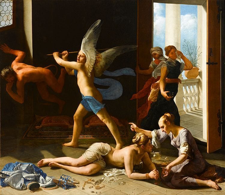 Parts of this scene are not exquisite. The painting made unprecedented demands on Cagnacci’s architectural draftsmanship, and he did not meet all of them. We are looking down at a window in the upper left corner at which we should be looking up, and conversely looking up at a balustrade at which we ought to be looking down. The fleeing maids’ faces are inchoate. The devil’s body seems to have been stunted in order to fit in the picture.